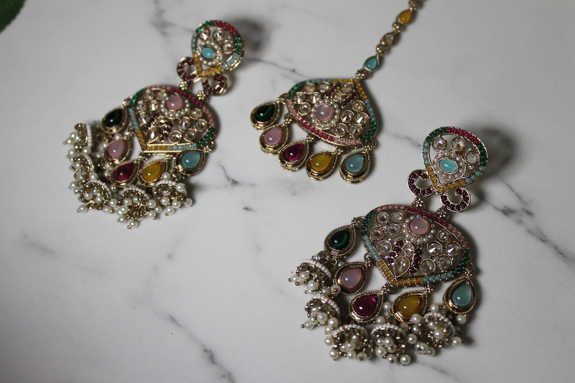 Made with premium quality materials, the set features intricate detailing with multicoloured Kundan stones with pearl detailing, set in a gold base, giving it a luxurious finish. The craftsmanship highlights the beauty of Indian heritage, combining artistry with modern day appeal.
