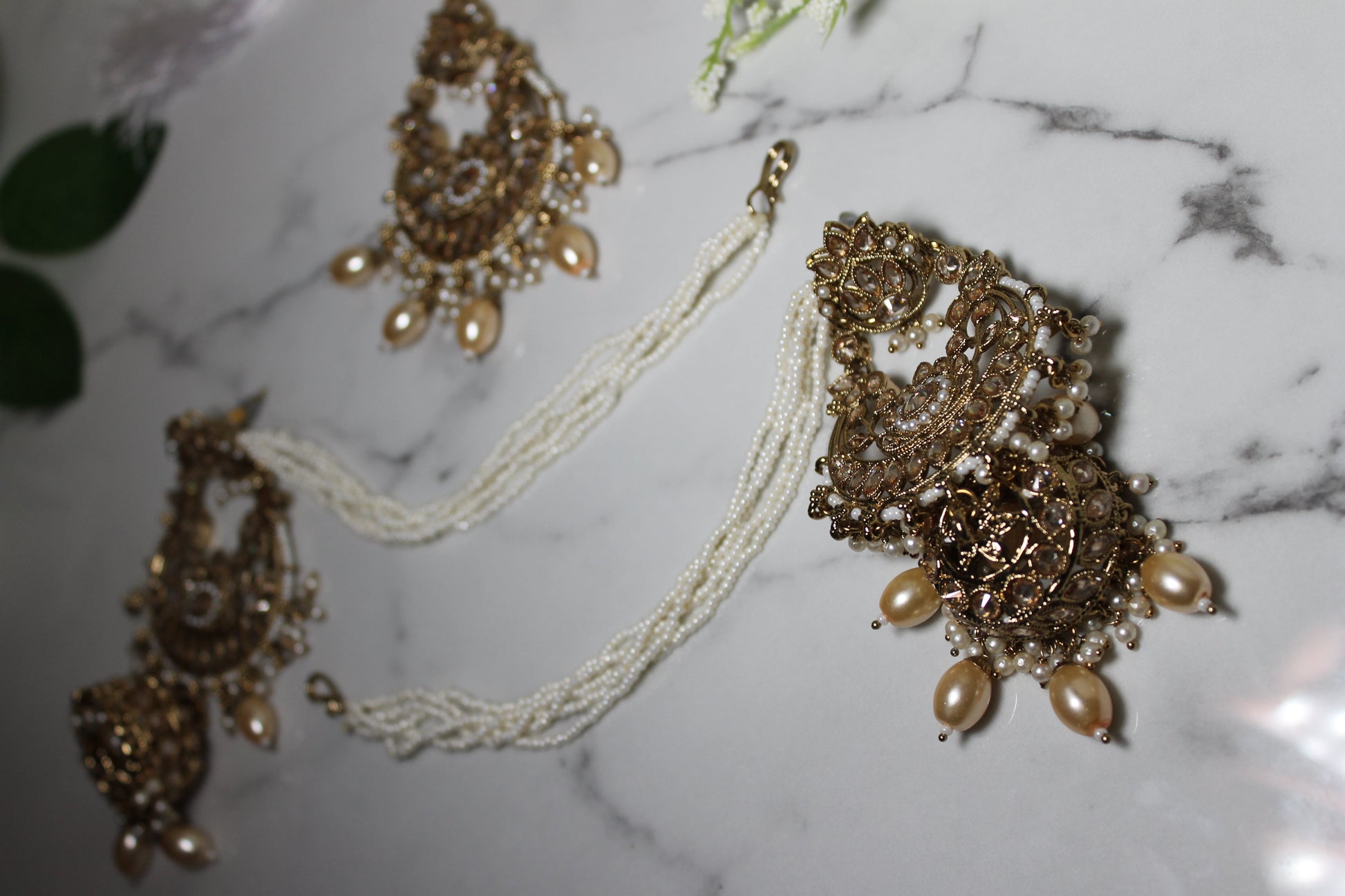 Made with premium quality materials, the set features intricate detailing with Kundan stones, set in a gold base, giving it a luxurious finish. This set includes detachable chains that can be added to enhance your look. The craftsmanship highlights the beauty of Indian heritage, combining artistry with modern day appeal.