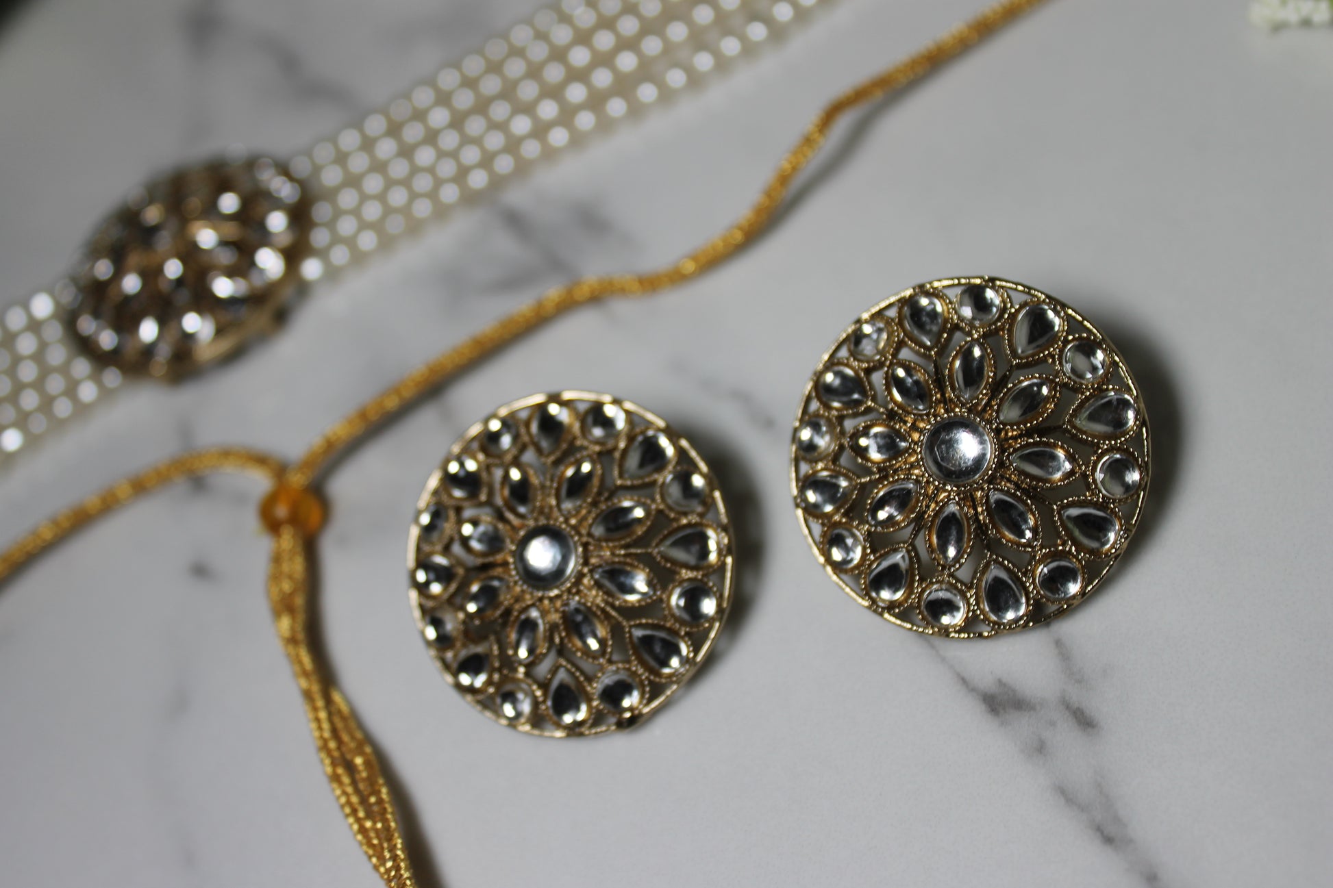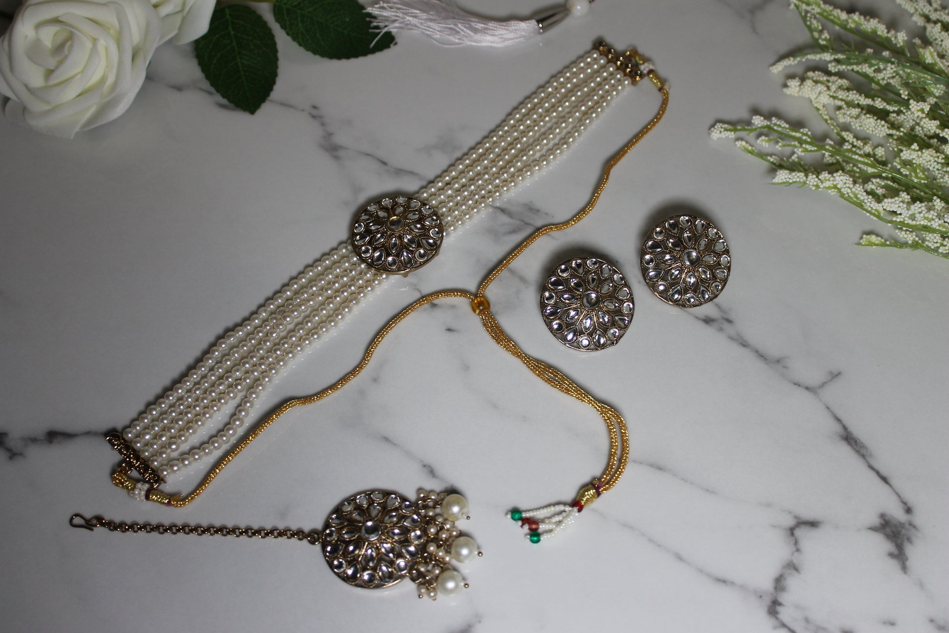 Made with premium quality materials, the set features intricate detailing with Kundan stones and pearl detailing, set in a gold base, giving it a luxurious finish. The craftsmanship highlights the beauty of Indian heritage, combining artistry with modern day appeal.